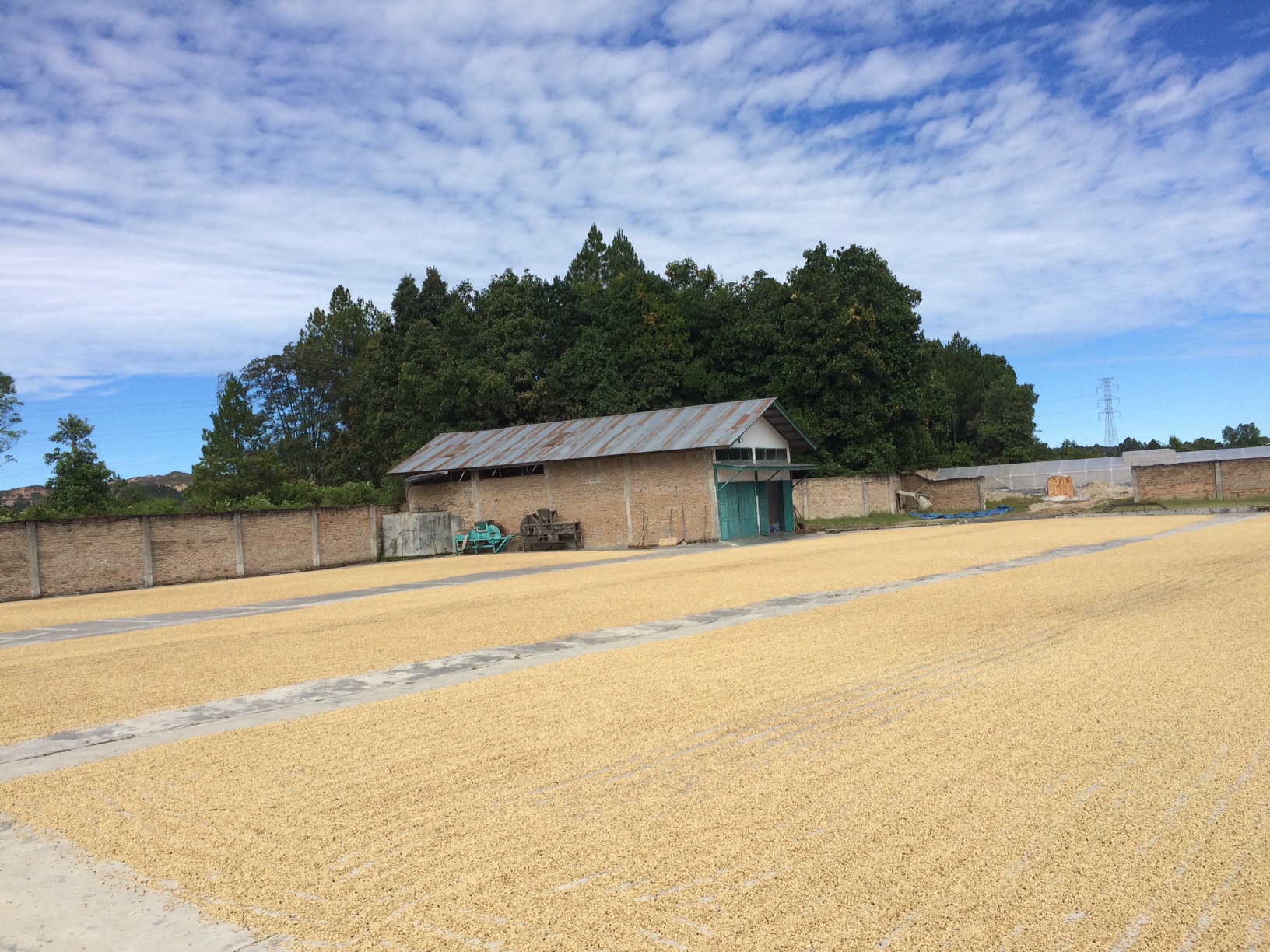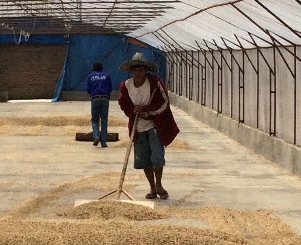 一時乾燥済パーチメント買付⇒脱穀⇒2次乾燥(パティオにて5日天日乾燥)⇒水分値安定のため30日間保管
