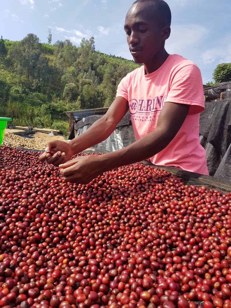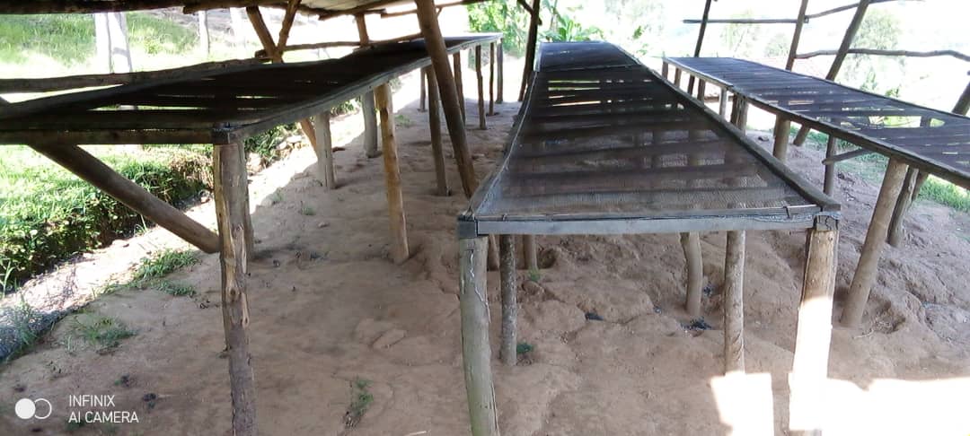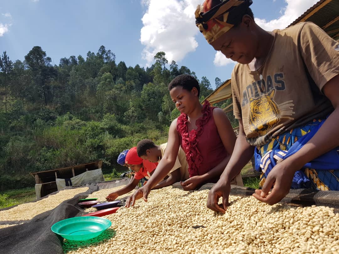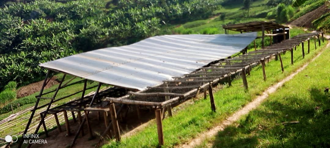 6.水洗直後に、屋根付きのアフリカンベッドでハンドソーティング。未成熟や虫食い(ポテト含む)が、パーチメントが濡れている間に識別がしやすいため7.屋根付きのアフリカンベッドで20~35日かけてゆっくり乾燥させる